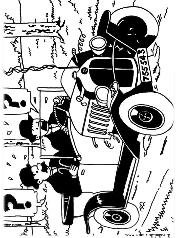 The detectives of Scotland Yard - Thomson and Thompson - are in their car, but looks like there is a problem with it. They are characters in The Adventures of Tintin!